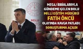 Edinilen bilgilere göre, söz konusu mesajlaşmayı fark eden öğretmenin eşi, olayın ardından öğle saatlerinde Bolu İl Milli Eğitim Müdürlüğü binasına geldi. Burada Milli Eğitim Müdürü ile yüz yüze görüşen eşin, çıkan tartışma sırasında Milli Eğitim Müdürü’nü darp ettiği iddia edildi.Yaşanan arbede sonrası Milli Eğitim Müdürü’nün sağlık kuruluşuna giderek darp raporu aldığı öğrenildi. Olayın ardından tarafların birbirinden şikâyetçi olup olmadığına dair henüz resmi bir açıklama yapılmazken, emniyet birimlerinin konuyla ilgili inceleme başlattığı öne sürüldü.Kurum binasında yaşandığı iddia edilen olay, eğitim camiasında ve kamuoyunda büyük tepkiye neden olurken, gözler Bolu Valiliği ve Milli Eğitim Bakanlığı’ndan yapılacak olası açıklamalara çevrildi.Öte yandan, iddiaların doğruluğu ve olayın tüm yönleriyle aydınlatılması için resmi makamların yürüteceği soruşturmanın sonucu bekleniyor. Taraflardan şu ana kadar kamuoyuna yönelik herhangi bir yazılı açıklama yapılmadı.Gelişmelerin netleşmesiyle birlikte olayın perde arkasının ortaya çıkması bekleniyor.kaynak: https://boluhedef.com/haber/bolu-milli-egitim-mudurlugunde-skandal-iddiaİşin ilgin tarafı ise ilgili il müdürünün, okul müdürlerine gönderdiği mesajla, “Aileleriyle Birlikte Çocuklar Camide 2024” projesi için talimat verdi. Mesajda, proje kapsamında veli, öğretmen ve öğrencilerin camideki akşam namazına katılması için gerekli duyurunun yapılması istendi.Bolu İl Milli Eğitim müdürü “Aileleriyle Birlikte Çocuklar Camide 2024” projesi kapsamında öğrenci, öğretmen ve velileri 3 Ekim akşamı Bilal-i Habeşi Camii’nde akşam namazına çağrıldı. Velilere, öğretmenlerin ve öğrencilerin katılması için okul müdürlerine gönderilen mesajda şöyle denildi:“Değerli müdürlerim, hayırlı sabahlar. Yarın akşam yapacağımız akşam namazı programının tüm veli, öğretmen ve öğrencilerimize ulaştırılması gerekiyor. Hassasiyetiniz için teşekkür ederim. Bekliyoruz.”