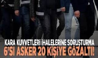 Ankara Cumhuriyet Başsavcılığı’nın talimatıyla Kara Kuvvetleri Komutanlığı’na ait askeri yük ve yolcu taşıma ihalelerinde yaklaşık 23 milyon 578 bin TL kamu zararı oluştuğu iddiasıyla operasyon düzenlendi. Edimin ifasına fesat karıştırma ve rüşvet suçlamasıyla 6’sı asker 14’ü sivil olmak üzere 20 şüpheli gözaltına alındı.